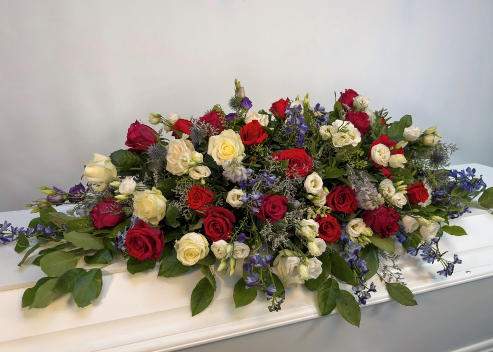 Smuk klassisk kistepynt i rød, blå og hvid. Kistepynten er lavet i en enkel og naturlig stil.