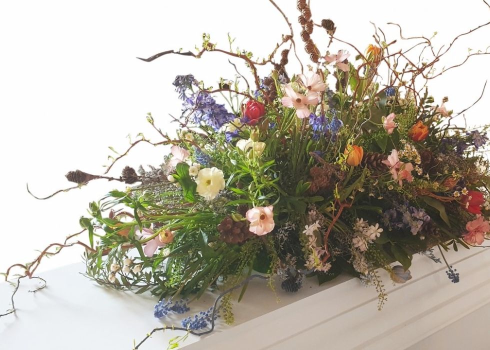 Blomster: Et mix af årstidens blomster, som giver et udtryk af blomstereng og med natur greneffekt. Et hav af farver sat sammen med smukt og levende grønt.