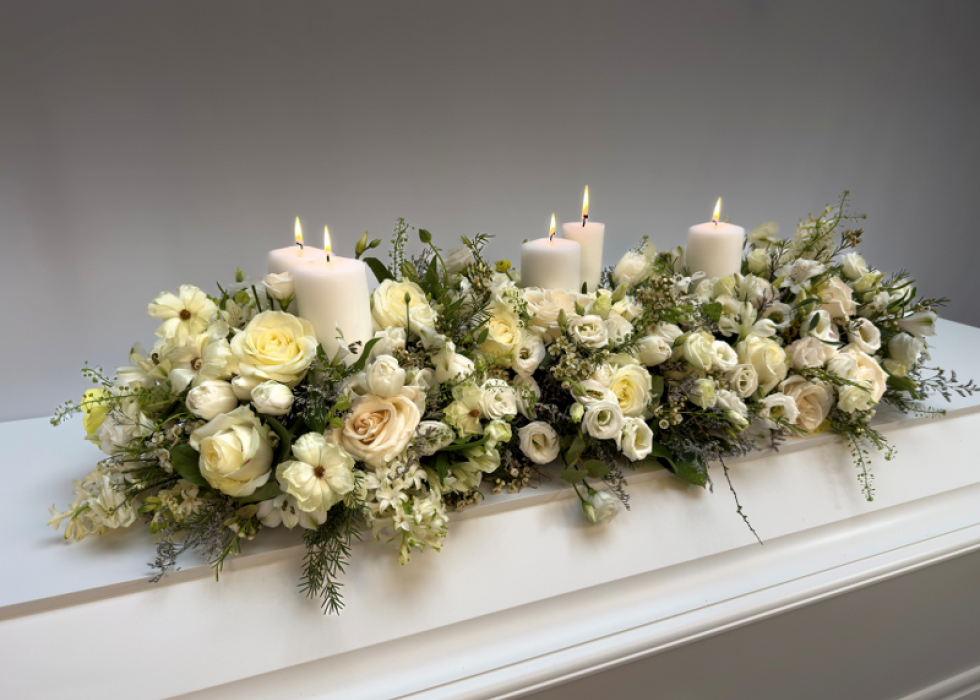 Smuk kistepynt med 3 levende lys og blomster liggende som en ranke over kisten.