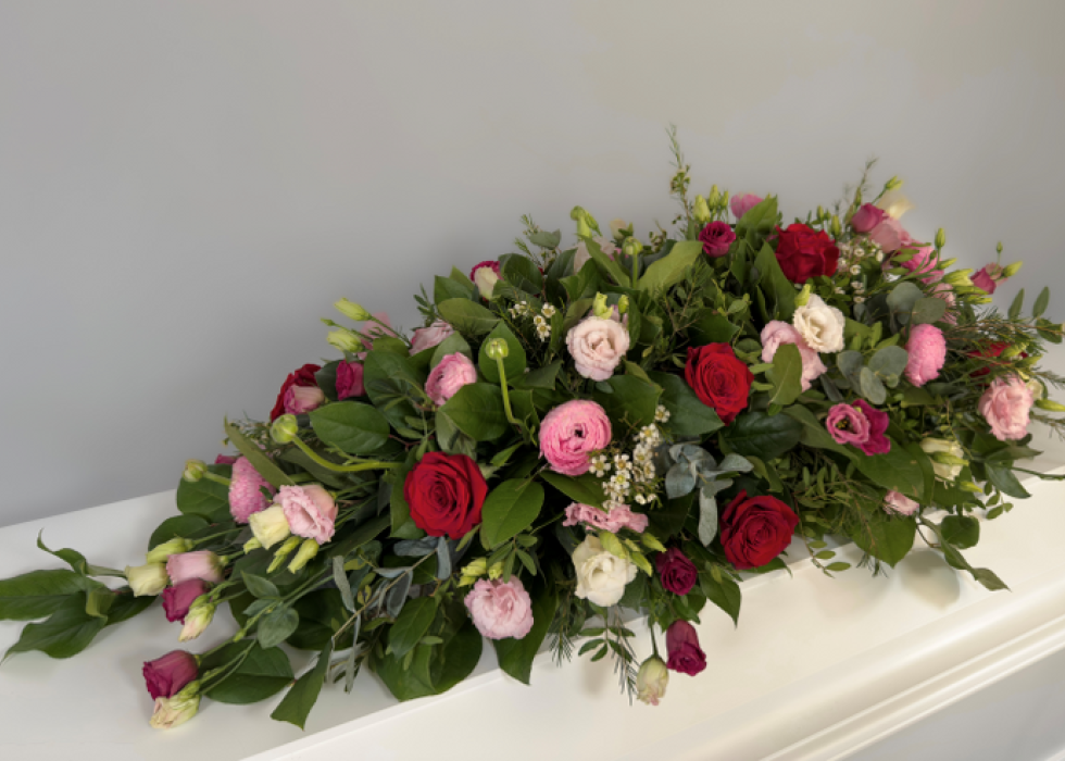 Smuk klassisk kistepynt i rosa og med røde roser. Kistepynten er lavet i en enkel og naturlig stil.