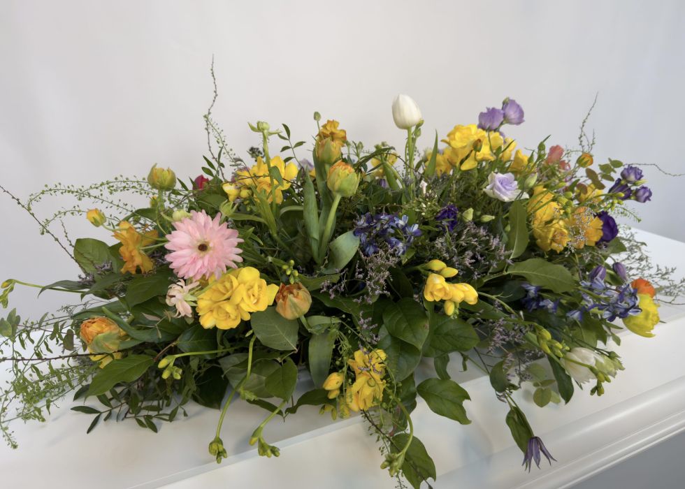Blomster: Et mix af årstidens blomster som giver et udtryk af blomstereng. Let og luftig.
