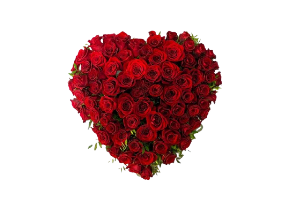 Stort hjerte fyldt med smukke røde storhoved roser. Der er en smule grønt i kanten som giver et naturligt udtryk. Hjertet fylder smukt i kirken. Røde roser er det ultimative symbol på kærlighed, hjertet kan laves med andre farver roser alt efter ønske.