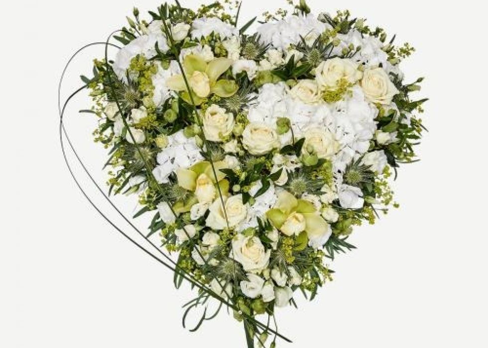 Lukket hjerte, i tæt stil i lime og hvid. Blomsterne er et mix af roser, lisiantus, nelliker og andre blomster i sæson.