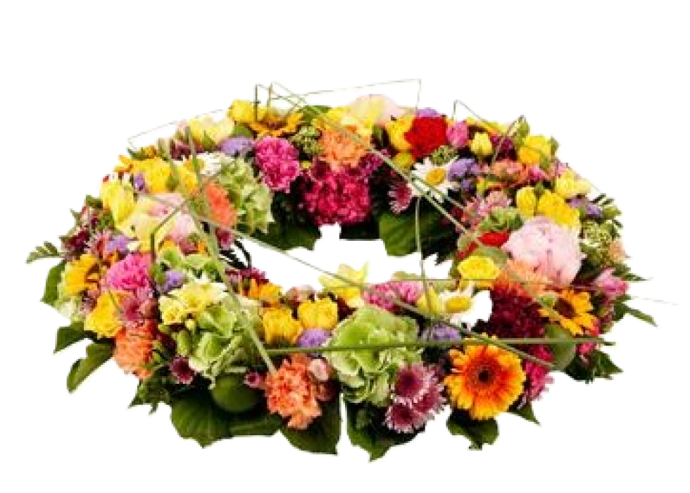 Rundpyntet krans med mange stærke farver. En blanding af blomster, som giver et levende udtryk. Lidt græsser i kransen. Et farverigt sidste farvel.