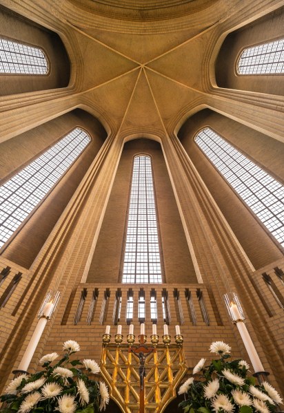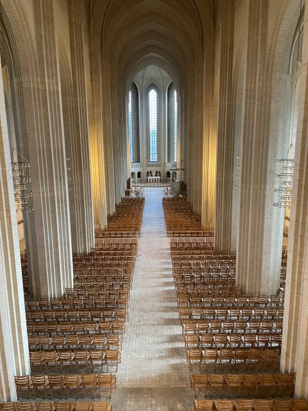 Det er en monumental og arkitektonisk særpræget kirke i lysegule mursten med høje hvælvinger, slanke søjler og et smukt, blødt lysindfald, som skaber en rolig og højtidelig stemning.