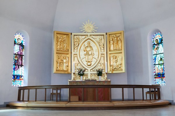Taget er belagt med røde teglsten, og kirken fremstår som en karakteristisk og synlig bygning i Hellerup. I 1918 blev det oprindelige mindre kor erstattet af et større, som i dag danner rammen om alterpartiet. Koret er udsmykket med smukke glasmosaikvinduer – blandt andet et vindue fra år 1900 udført af C.N. Overgaard samt fire vinduer fra 1918 af Johs. Kragh, der forestiller de fire ærkeengle. Kirkerummet fremstår lyst og højtideligt og danner en værdig ramme om kirkelige handlinger.