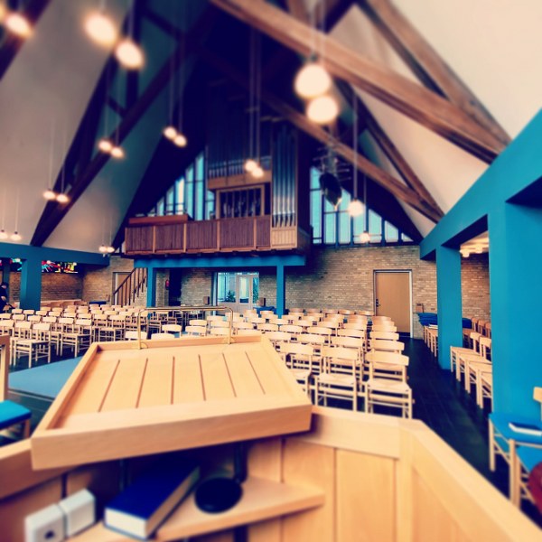 Indvendigt er kirkerummet enkelt og lyst. Det høje loft og det store trekantede vindue i gavlen bag alteret giver et smukt lysindfald, som skaber en rolig og værdig stemning under ceremonier. Siddepladserne består af individuelle stole, hvilket giver fleksibilitet i indretningen af rummet.