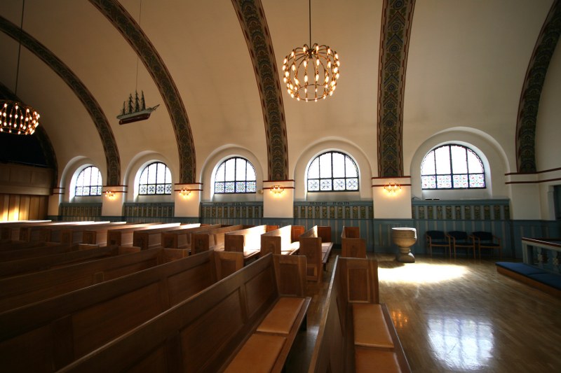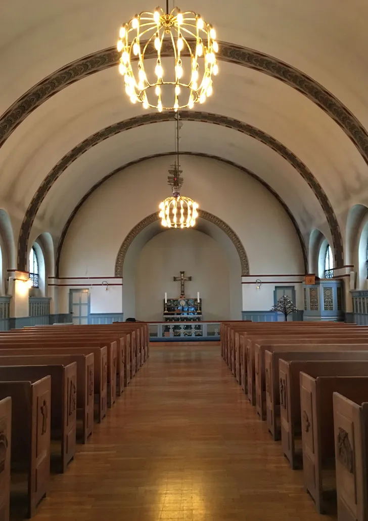 Kirkerummet er præget af høje hvælvinger og et smukt lysindfald fra de rundbuede vinduer, hvilket skaber en lys og rolig stemning. Indretningen er enkel og harmonisk, hvilket understøtter kirkens værdige udtryk.