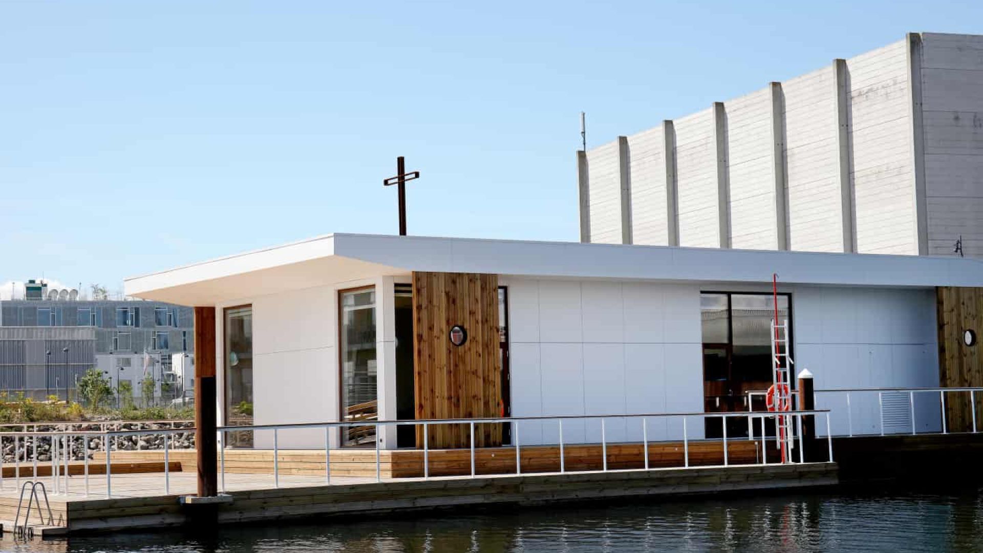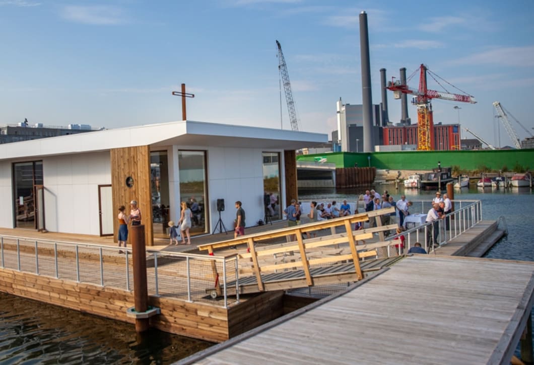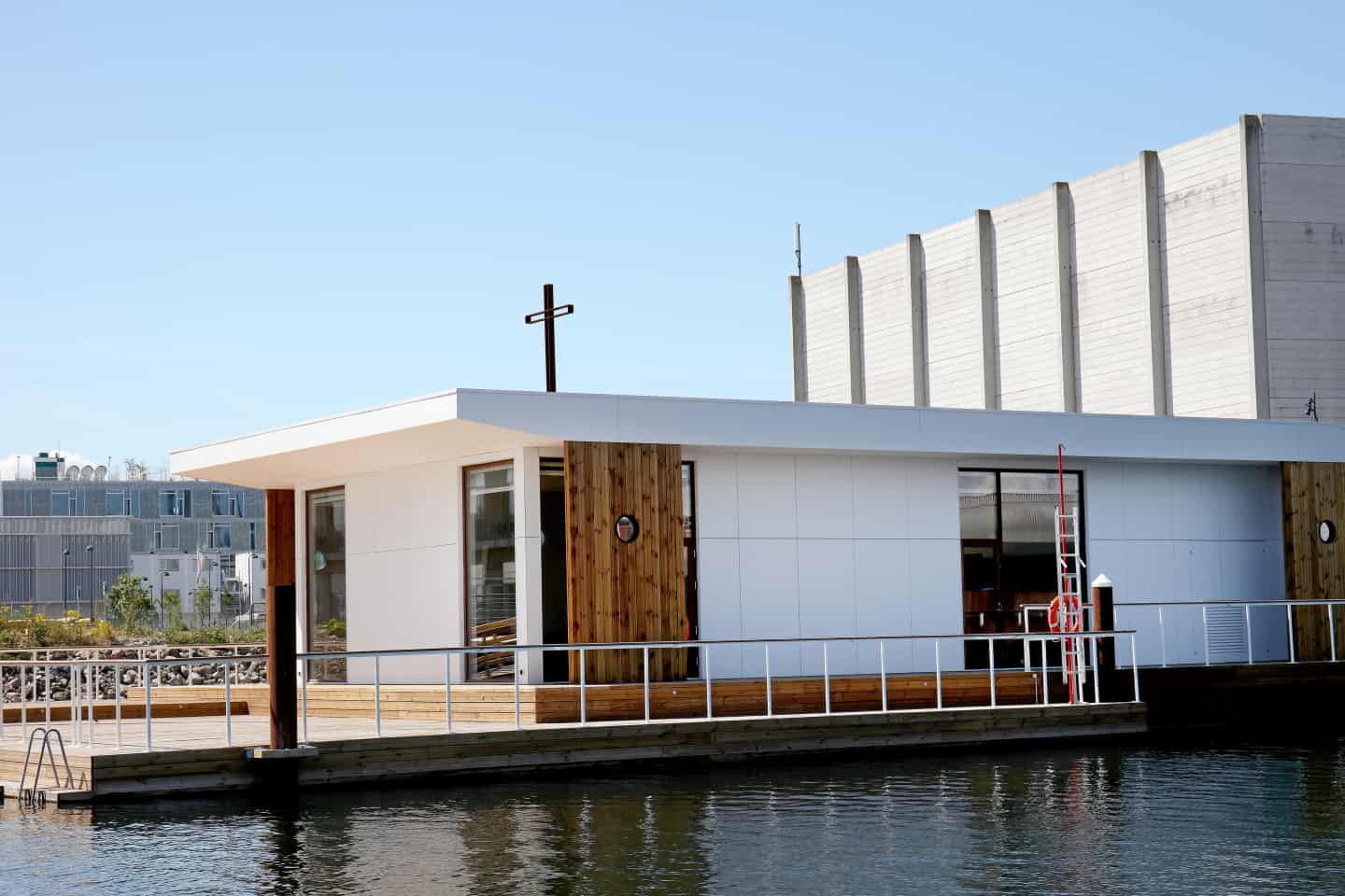 Kirkeskibet 2450 er en moderne kirke indrettet i en husbåd ved vandet. Kirkerummet er lyst og enkelt med store vinduer og en rolig atmosfære, der skaber en intim og nær ramme om ceremonien.