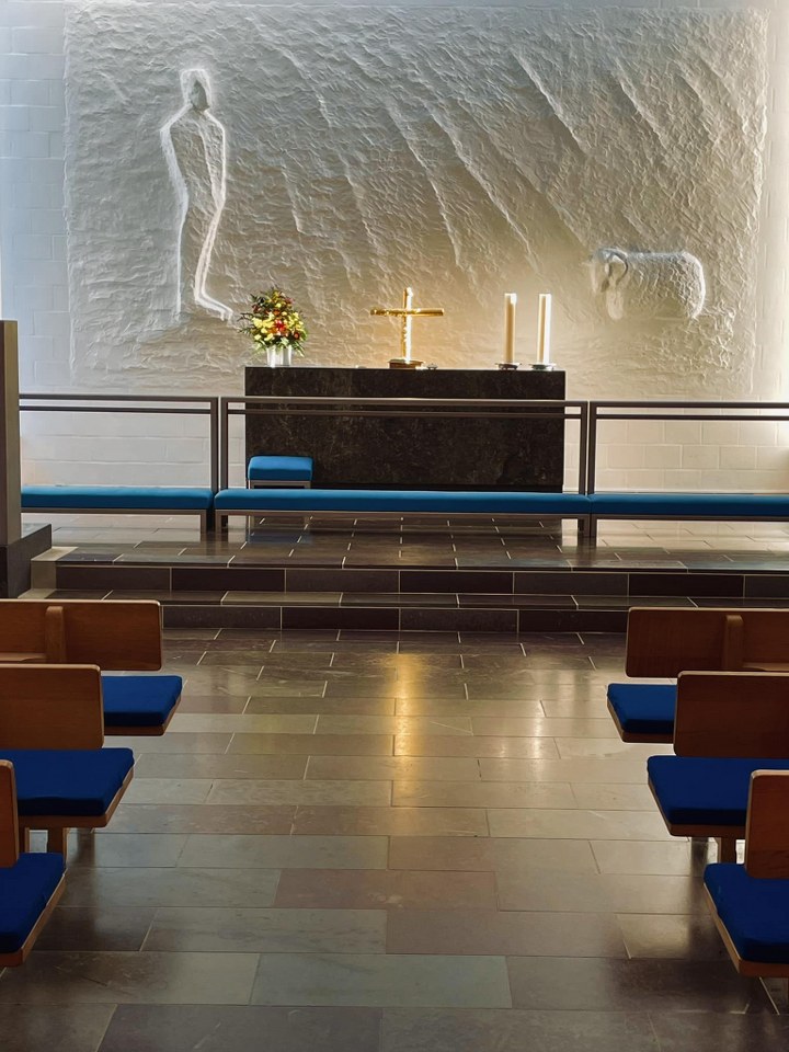 Indvendigt opleves Nærum Kirke lys og imødekommende med hvide vægge, bjælkeloft og moderne lyse kirkebænke, der understøtter en rolig atmosfære.