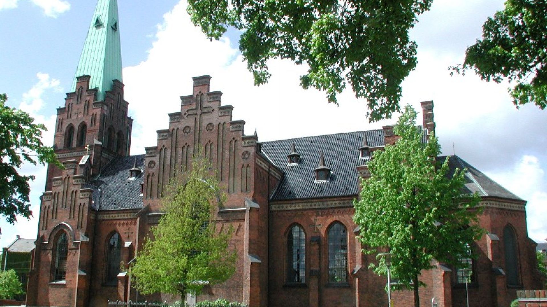 Sankt Johannes Kirke er en stor nygotisk kirke i røde mursten med et markant tårn og høje hvælvinger. Kirkerummet fremstår lyst med marmorerede vægge og lyseblå loftsdetaljer.
