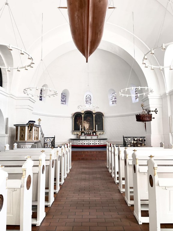 Kirkerummet er kort og bredt og tænkt, så menigheden sidder tæt på alteret, hvilket skaber en særlig nærhed i rummet. Alterbilledet “Hyrdernes tilbedelse” er malet af Axel Helsted og er et forstudie til altertavlen i Kristkirken i København.