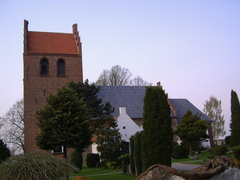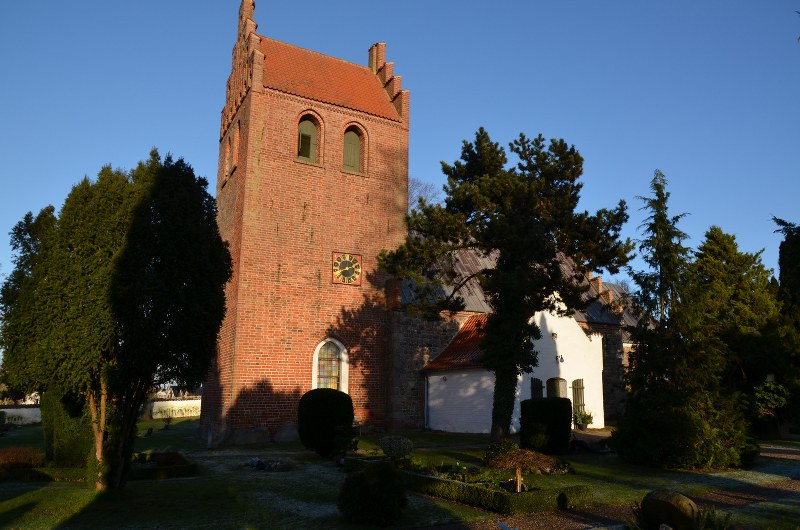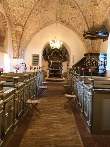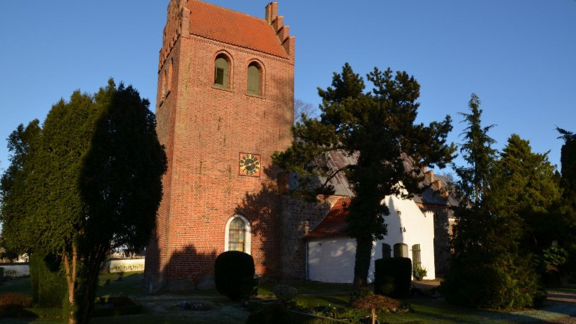 Lille, hvidkalket landsbykirke med rødt tegltag og omgivet af grøn kirkegård. Enkelt udtryk, rolige omgivelser og et klassisk kirkerum med blødt lys og afdæmpet stemning.